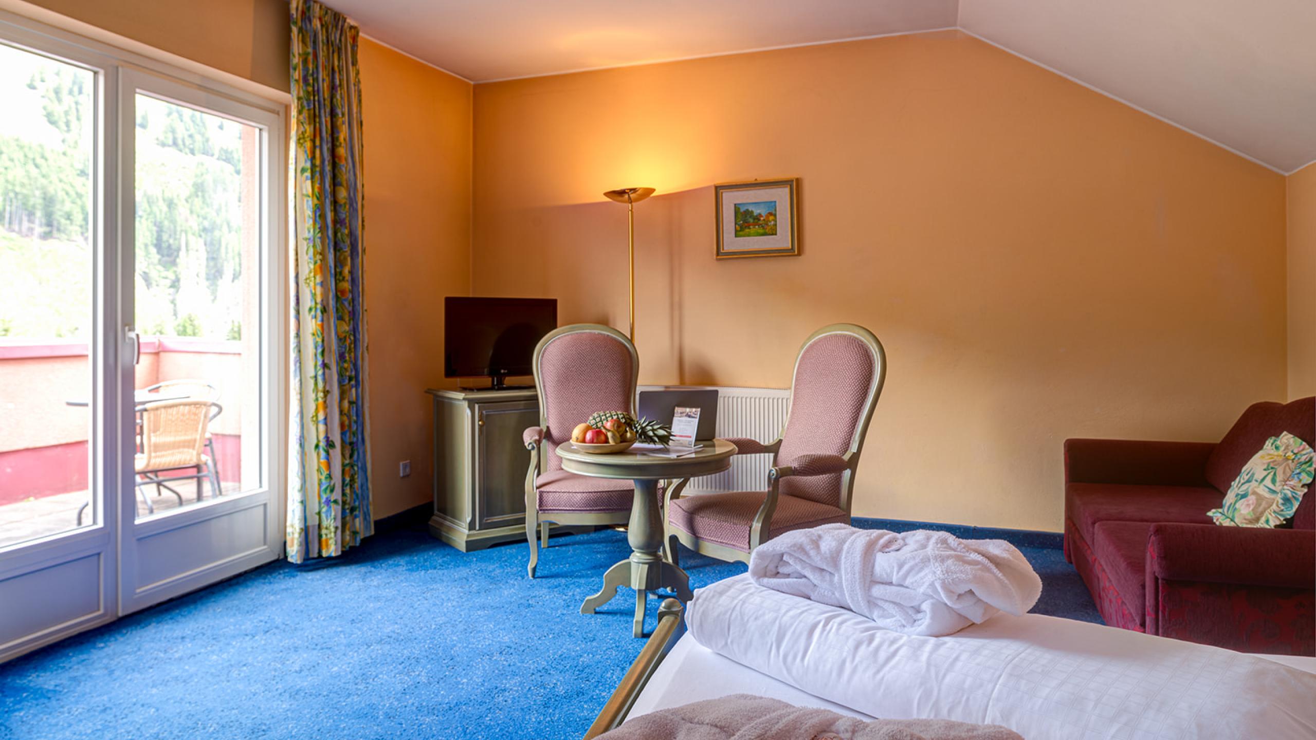 This double room (40 m²) with charm has a lounge/bedroom, walk-in wardrobe, bathroom with shower, toilet, mini bar and panoramic balcony with view over the valley.