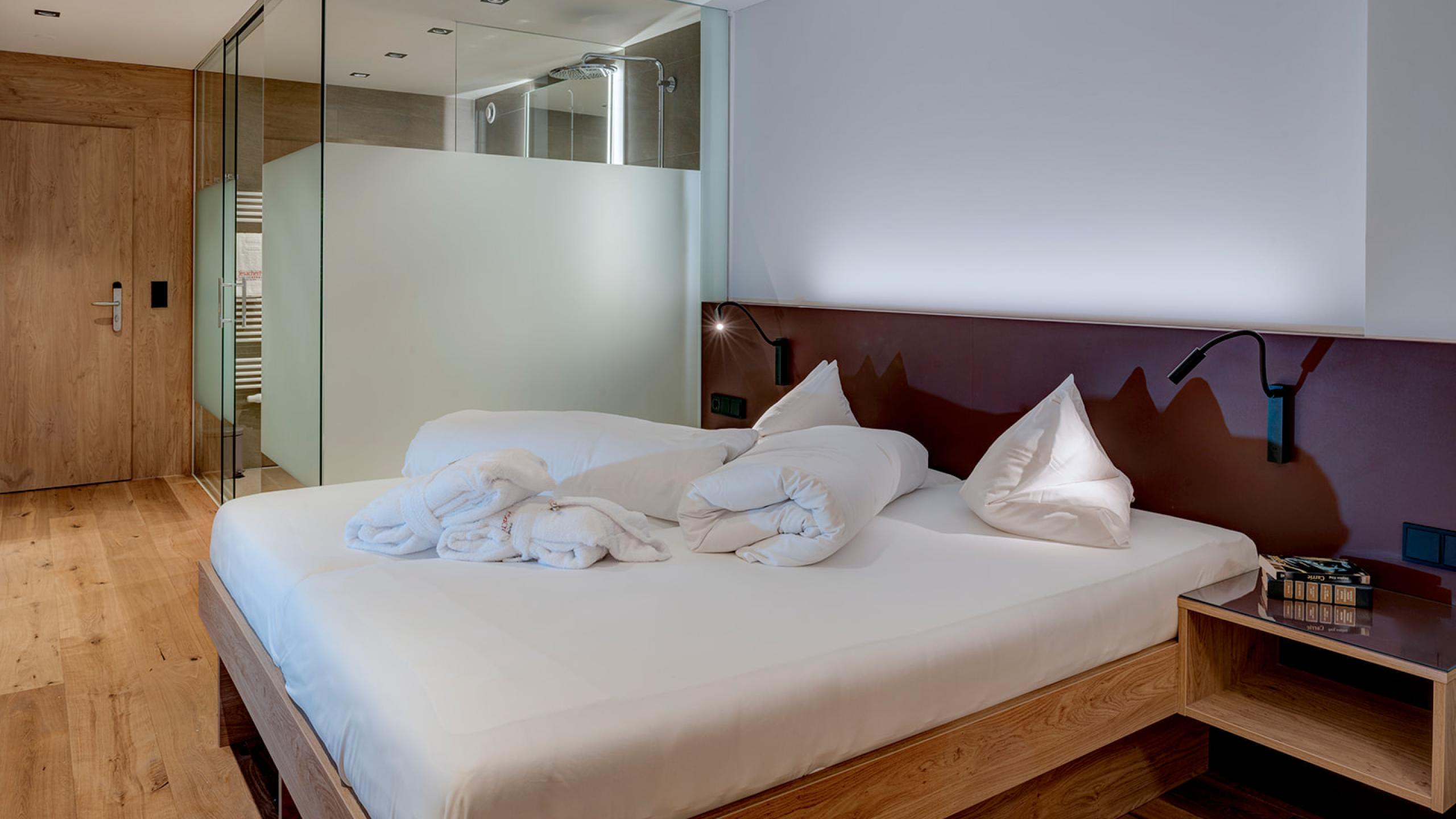 Accogliente camera doppia (32 m²) dal fascino tradizionale, in profumato legno di pino cembro locale e pavimento in parquet di quercia con zona notte abitabile, nuovo bagno con doccia e WC, minibar, balcone affacciato sul giardino. Prenotabile per 2 adulti e 2 bambini.