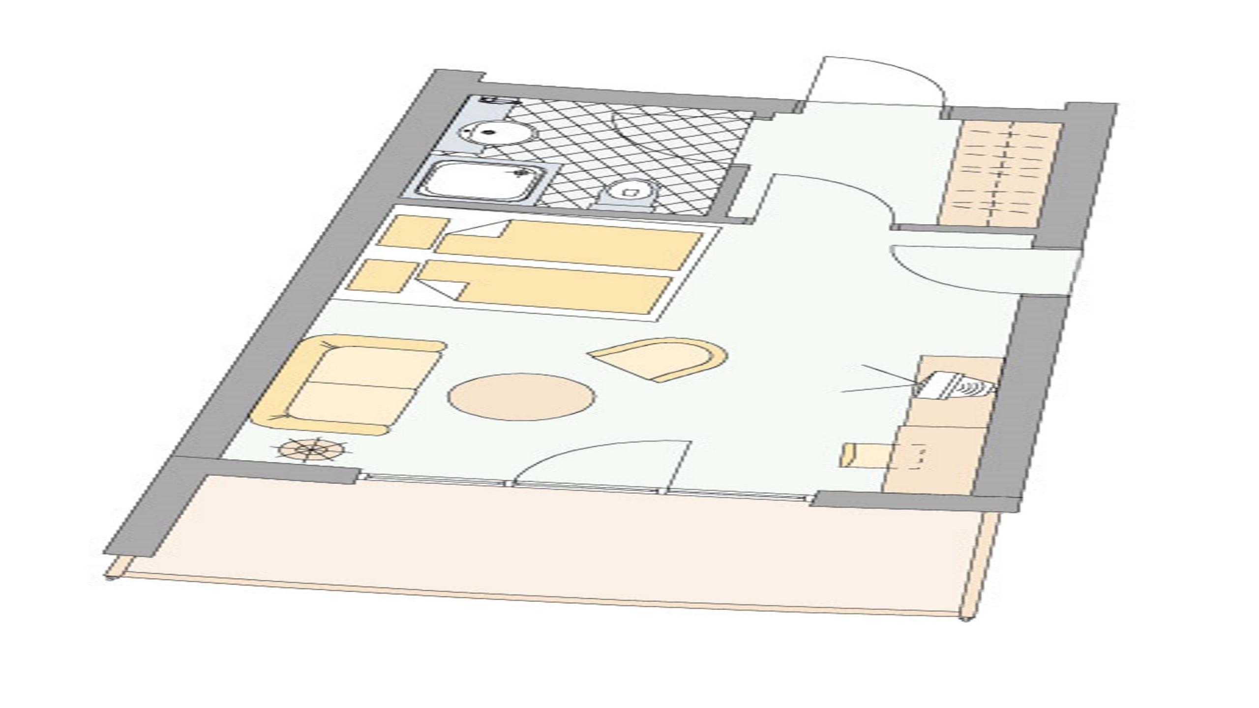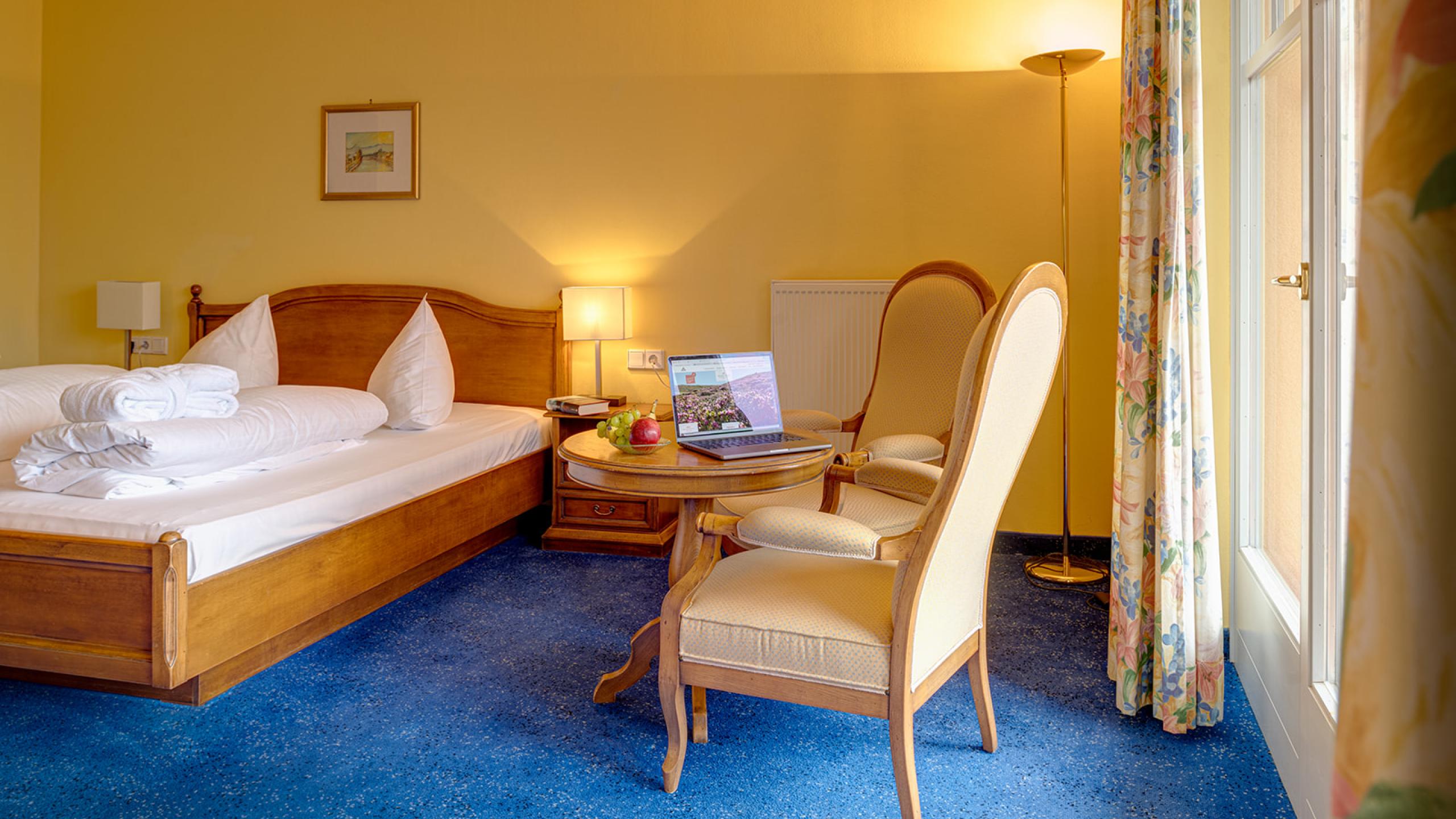 Deliziosa camera doppia (38 m²) con zona notte abitabile, bagno con doccia e WC, minibar e balcone con magnifica vista sulla vallata.