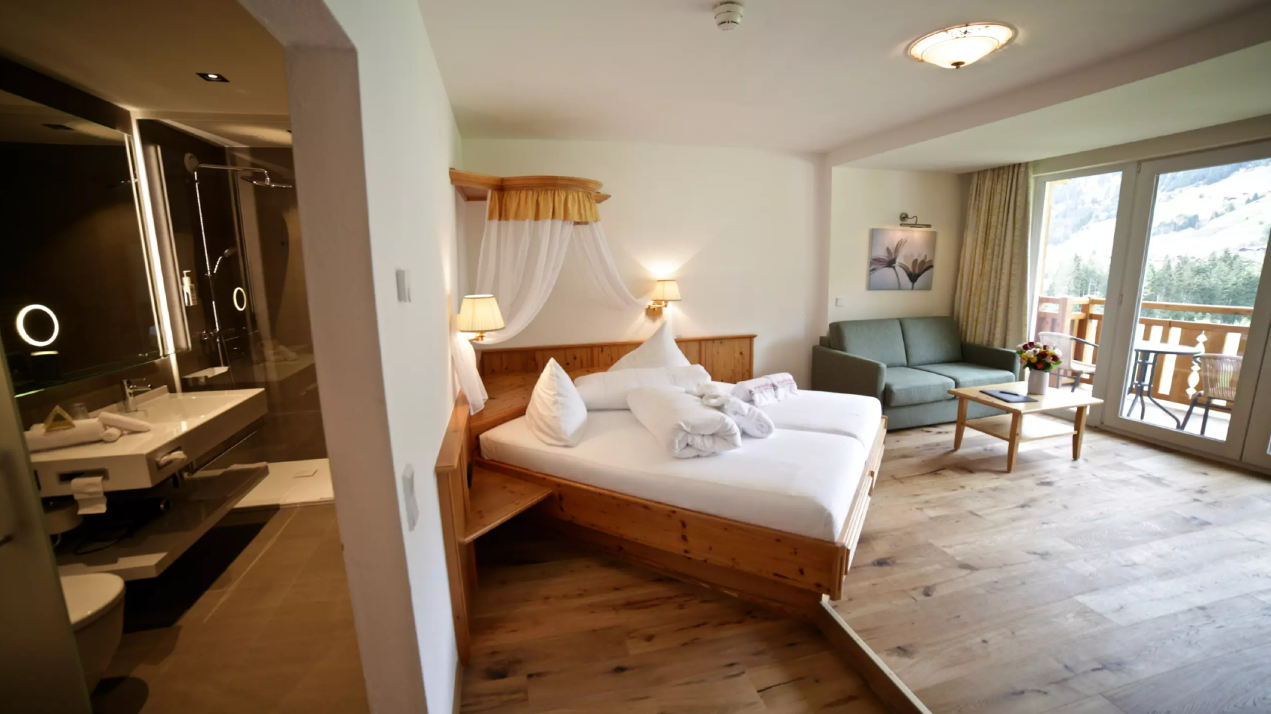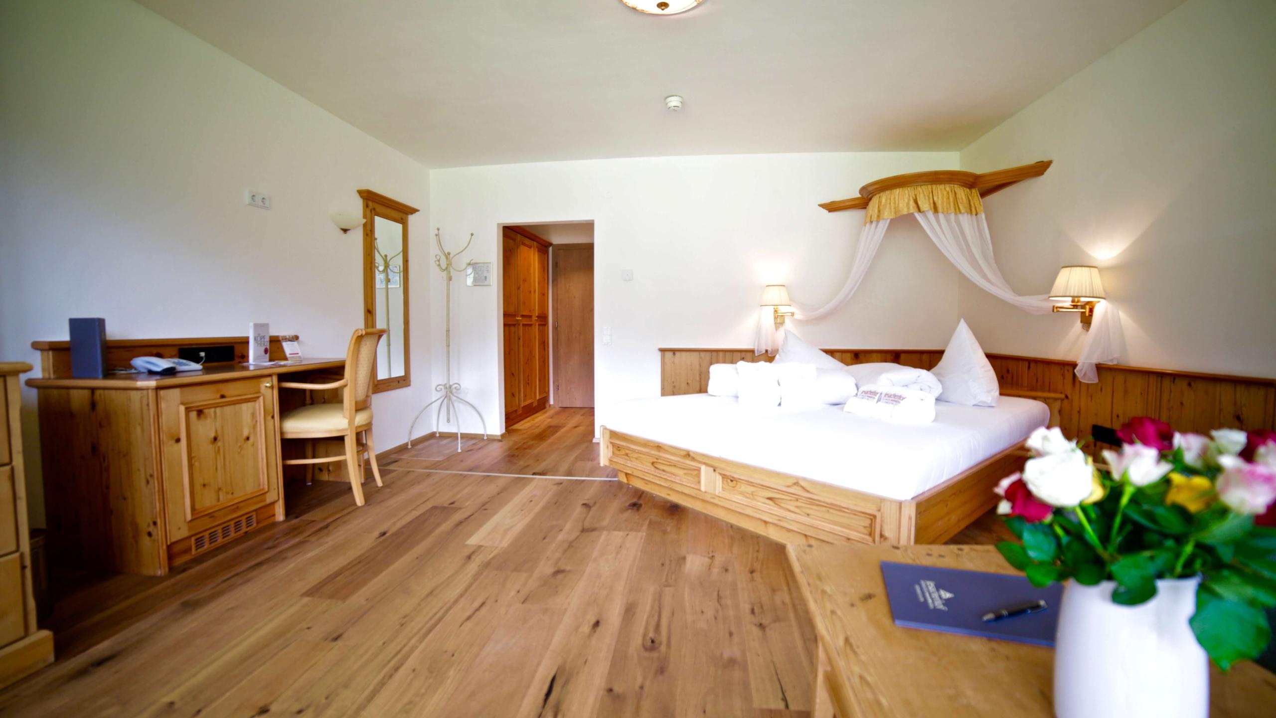 Due camere doppie di 70 m², collegate da un corridoio comune: ideali per le famiglie! Entrambe le camere sono arredate in abete rosso con pavimenti in parquet di rovere e dispongono di un bagno recentemente rinnovato, ciascuno con doccia e WC, balcone con vista panoramica. I prezzi si intendono per 2 adulti e 2 ragazzi.