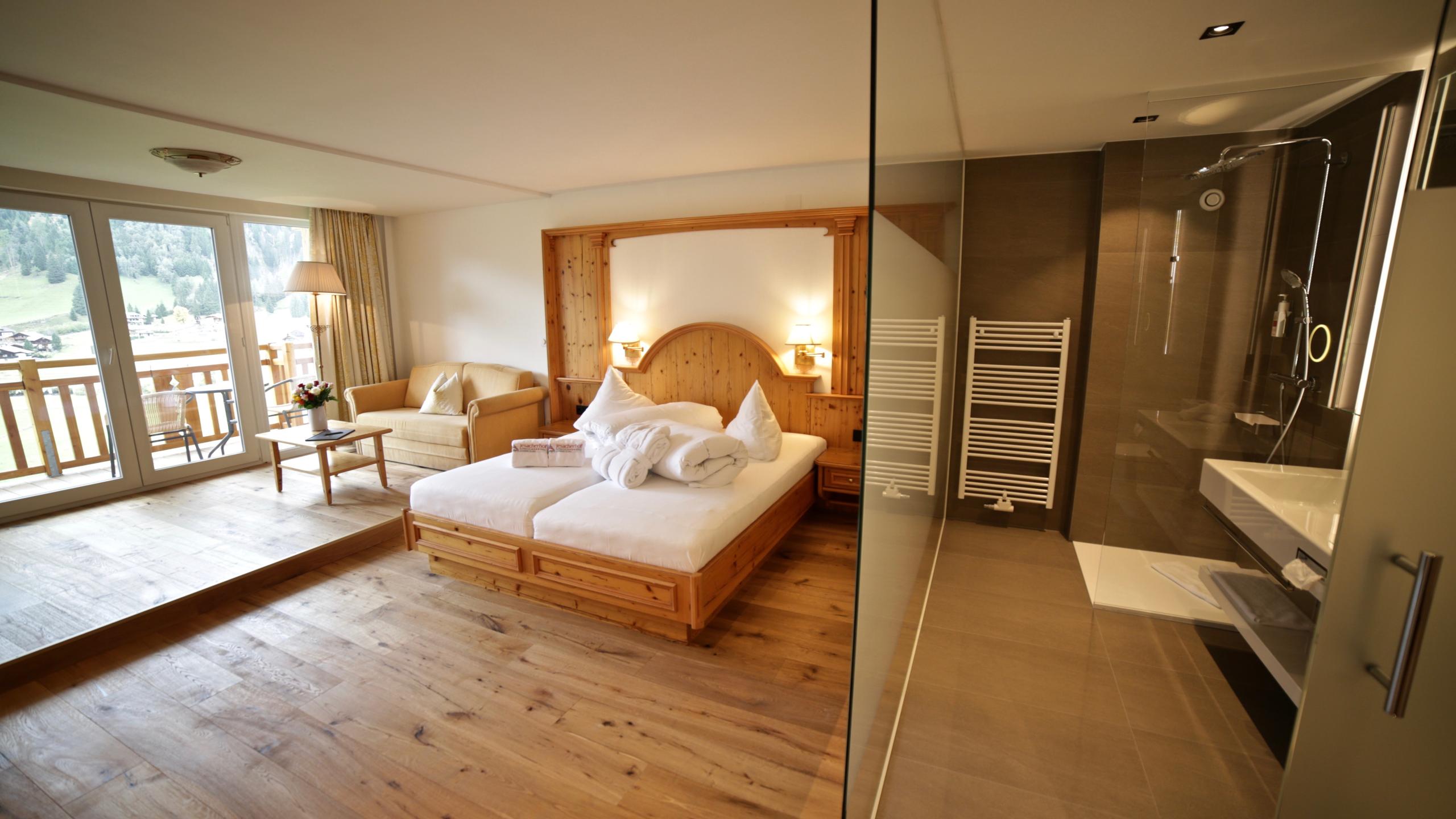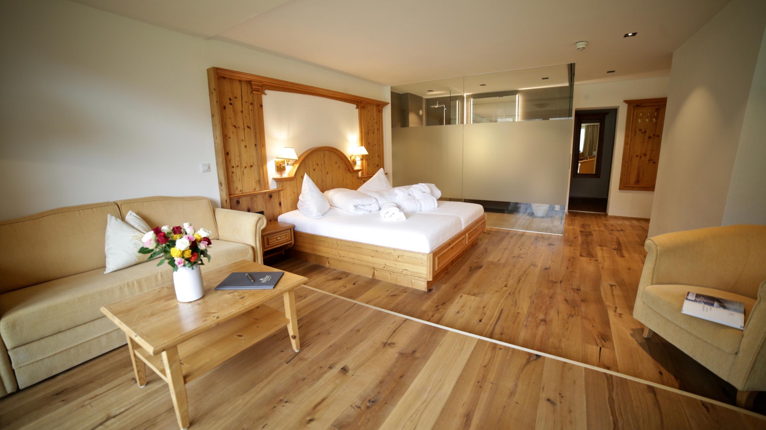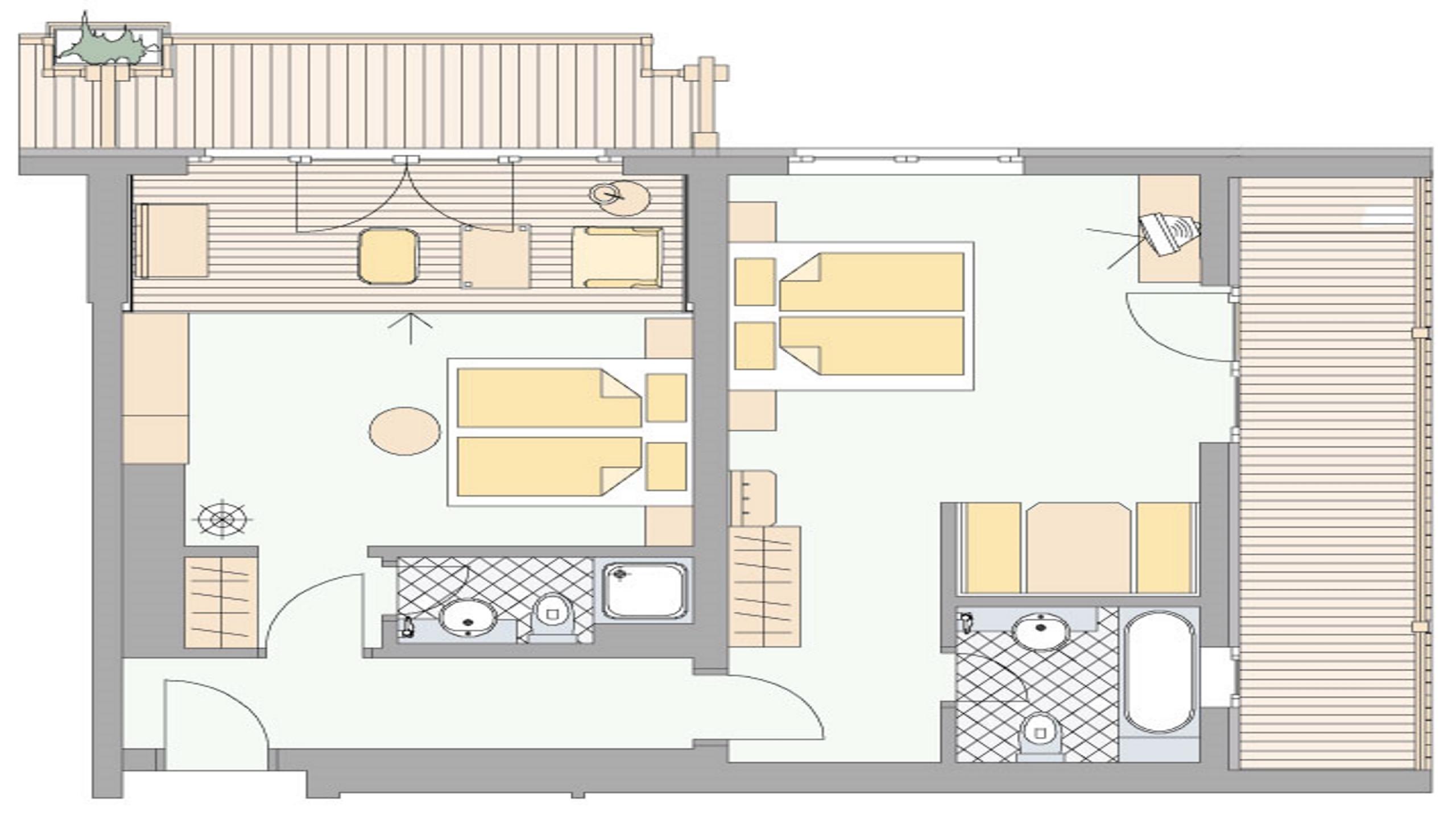 Due camere doppie di 57 m², collegate da un corridoio comune: ideali per le famiglie! Entrambe le camere sono arredate in abete rosso con pavimenti in parquet di rovere e dispongono di un bagno recentemente rinnovato, ciascuno con doccia e WC, balcone con vista panoramica. I prezzi si intendono per 2 adulti e 2 ragazzi.