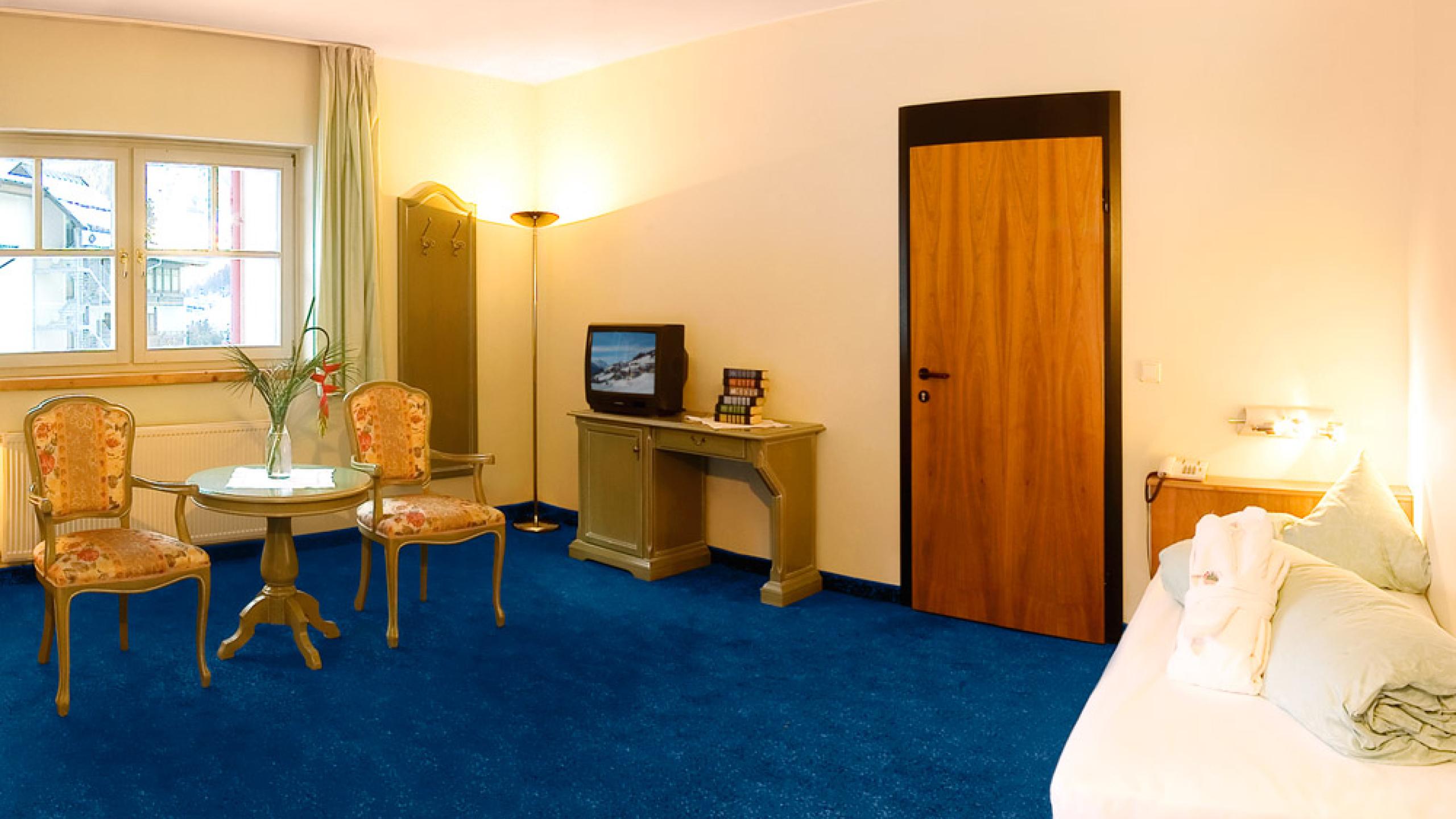 Confortevole camera singola (32 m²) con zona notte abitabile, bagno con doccia, WC, minibar, balcone o terrazza con il sole pomeridiano e magnifica vista sulla vallata.