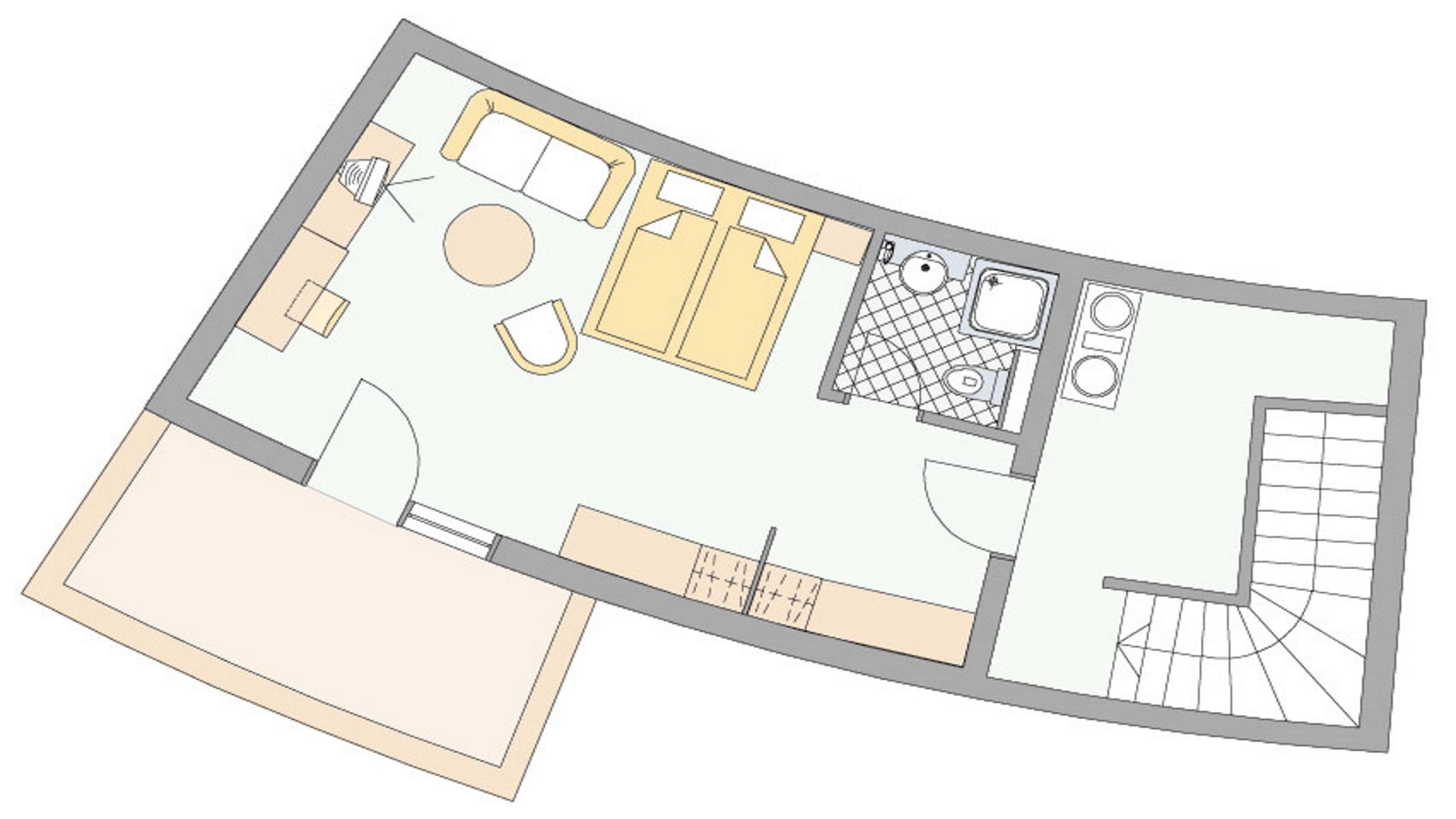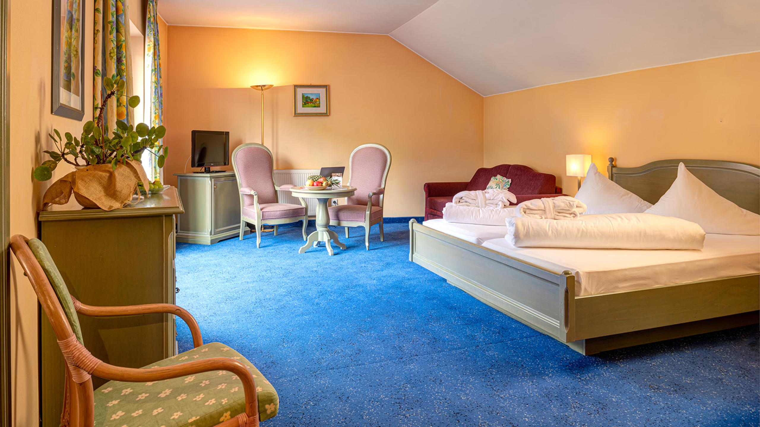Dieses Doppelzimmer (40 m²) mit Charme verfügt über einen Wohnschlafraum, begehbaren Kleiderschrank, Bad mit Dusche, WC, Minibar und Panoramabalkon mit Blick ins Tal.