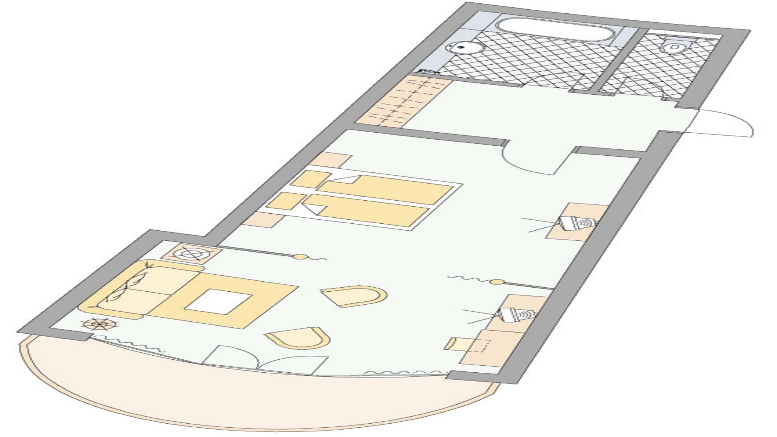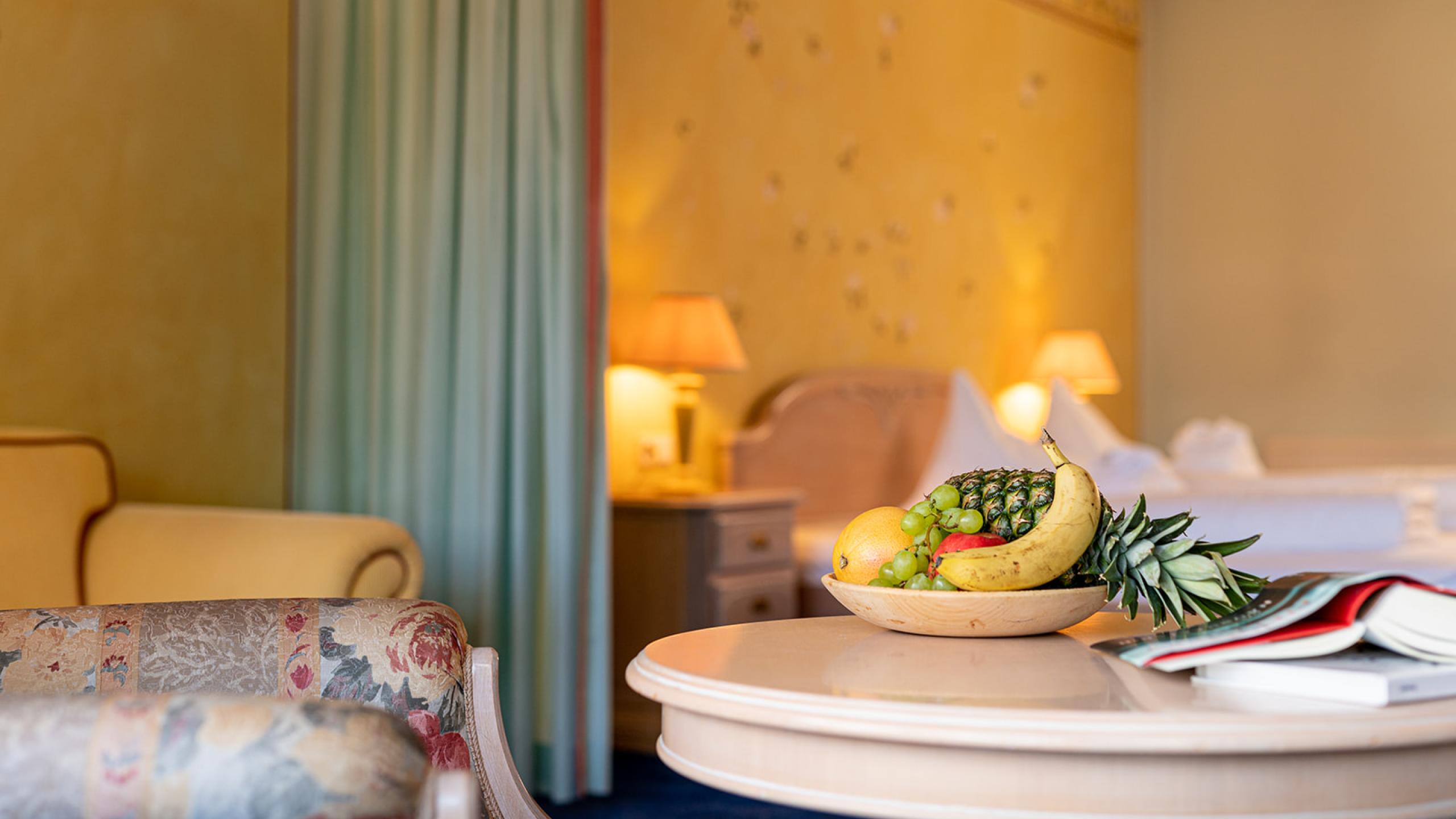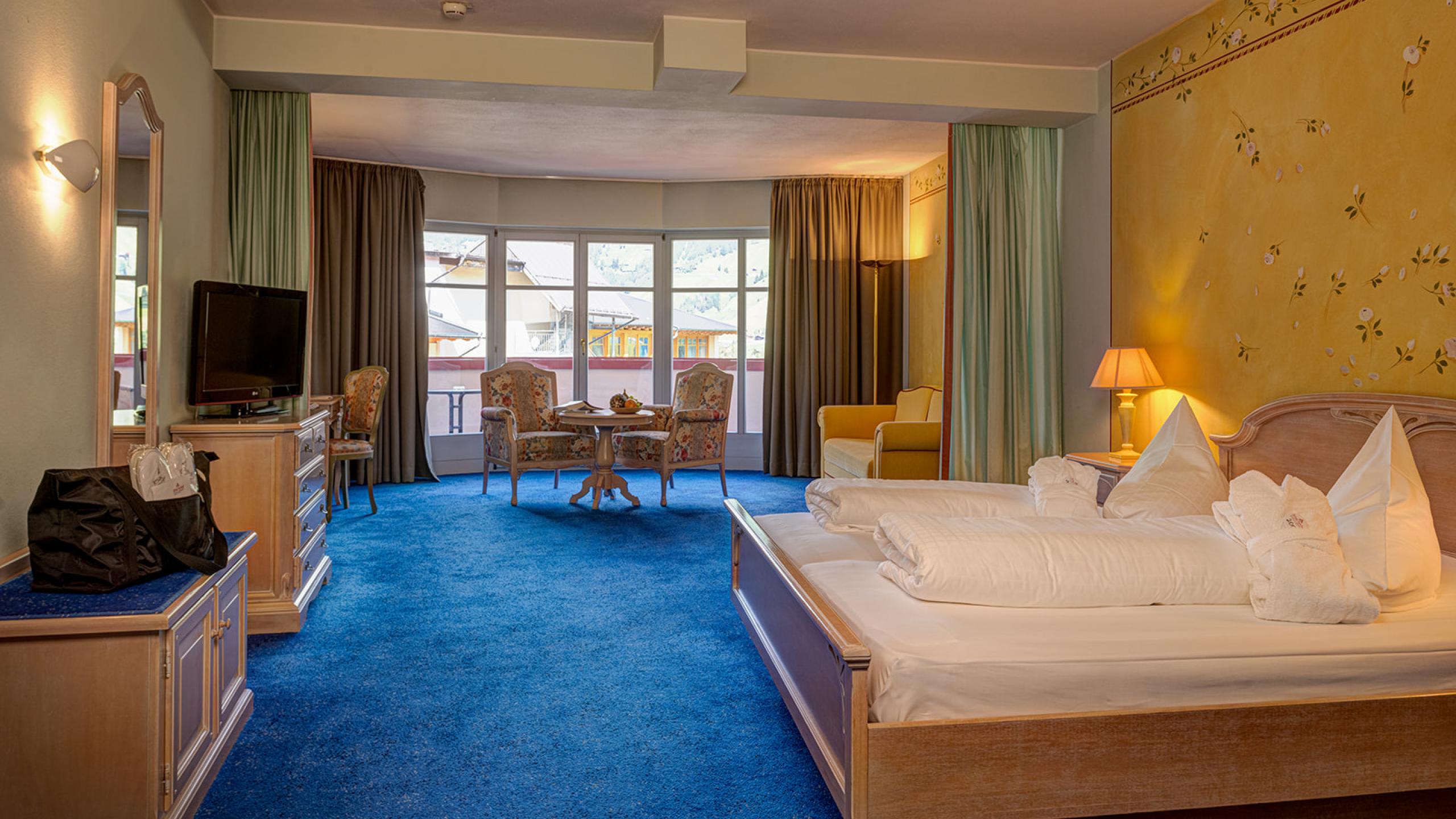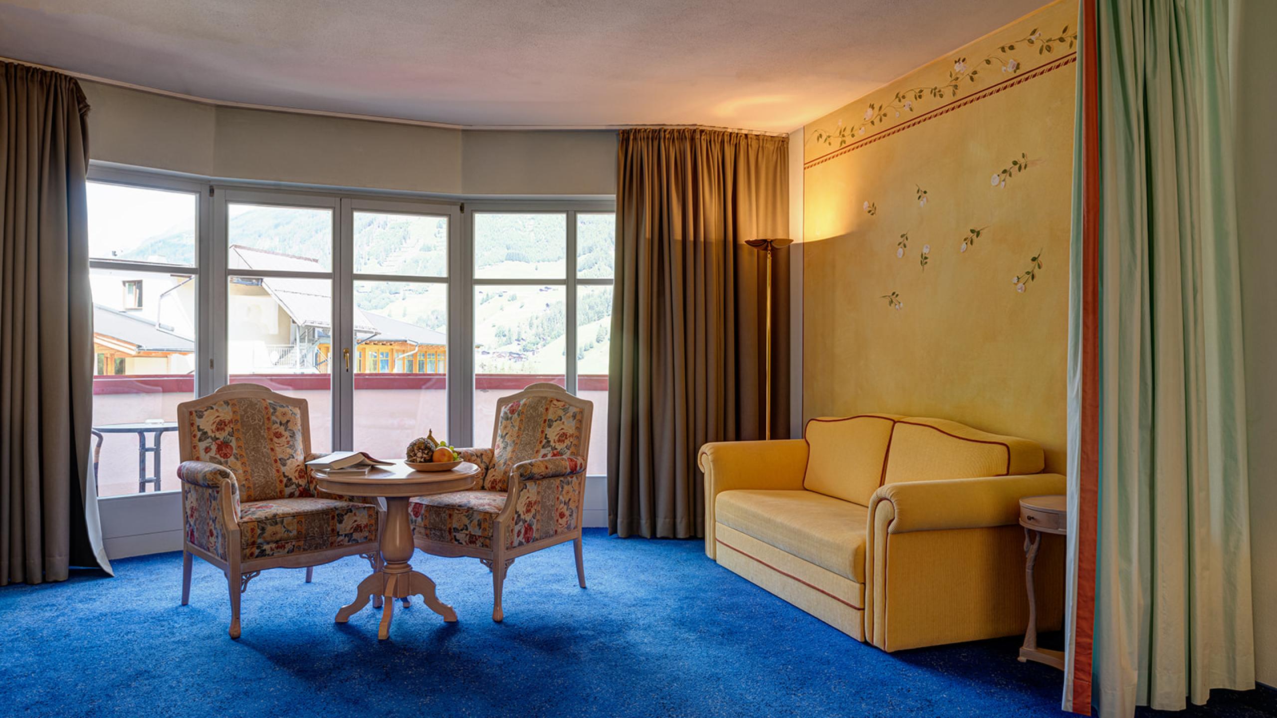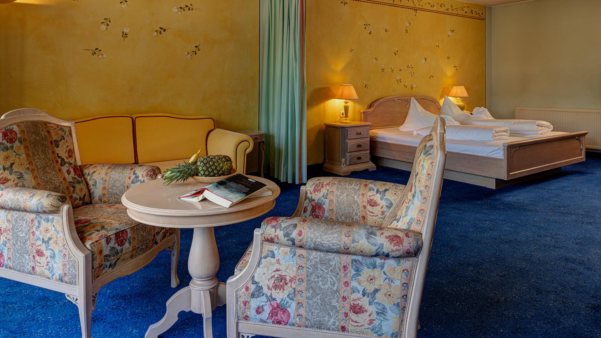 Romantische Suite mit großzügigem Wohn- und Schlafbereich (per Vorhang trennbar), Bad mit separatem WC, Minibar und Loggia. Buchbar für 2 Erwachsene und 2 Kinder.